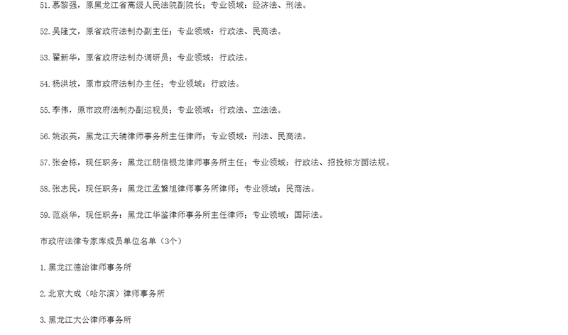 为了贯彻落实党的十八届三中、四中全会精神,切实提高全市各级行政机关依法行政的能力和水平,按照《哈尔滨市人民政府关于推行法律顾问制度的意见》和《哈尔滨市人民政府法律顾问工作规定》的规定,市政府法制办决定聘请多位法律业人士及黑龙江德治律师事务所等3个单位为市政府法律专家库成员单位,聘任期限从2016年8月1日起至2019年7月31日止。